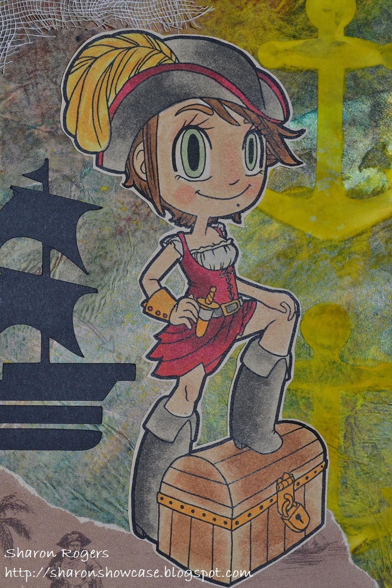 What a great "Nautical" theme we have for our October RAQ (Reader's Art Quest) at the Unruly Paperarts site!!!!! I just loved creating this journal page in my A4 size journal with a great Pirate Gal image from Some Odd Girl! I used Silhouette files to cut out the ship and Jolly Roger skull and the anchor stencil.